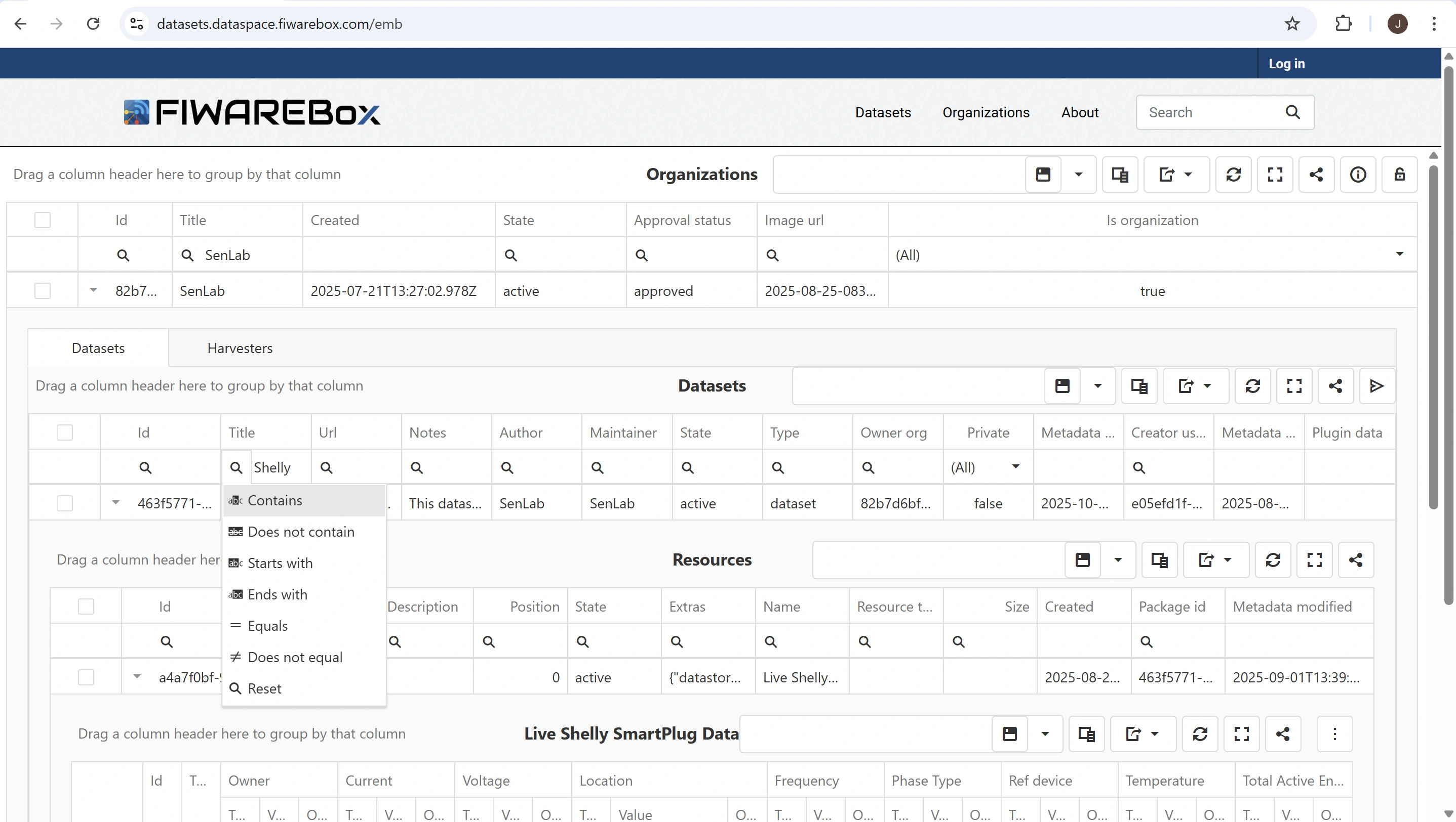 - RESOURCES AND HARVESTERS (EMB) — Inside a dataset, you find the resources (CSV files, APIs, streams) and information about how the data is harvested or updated (manual upload, CKAN harvester, FIWARE connector, etc.).