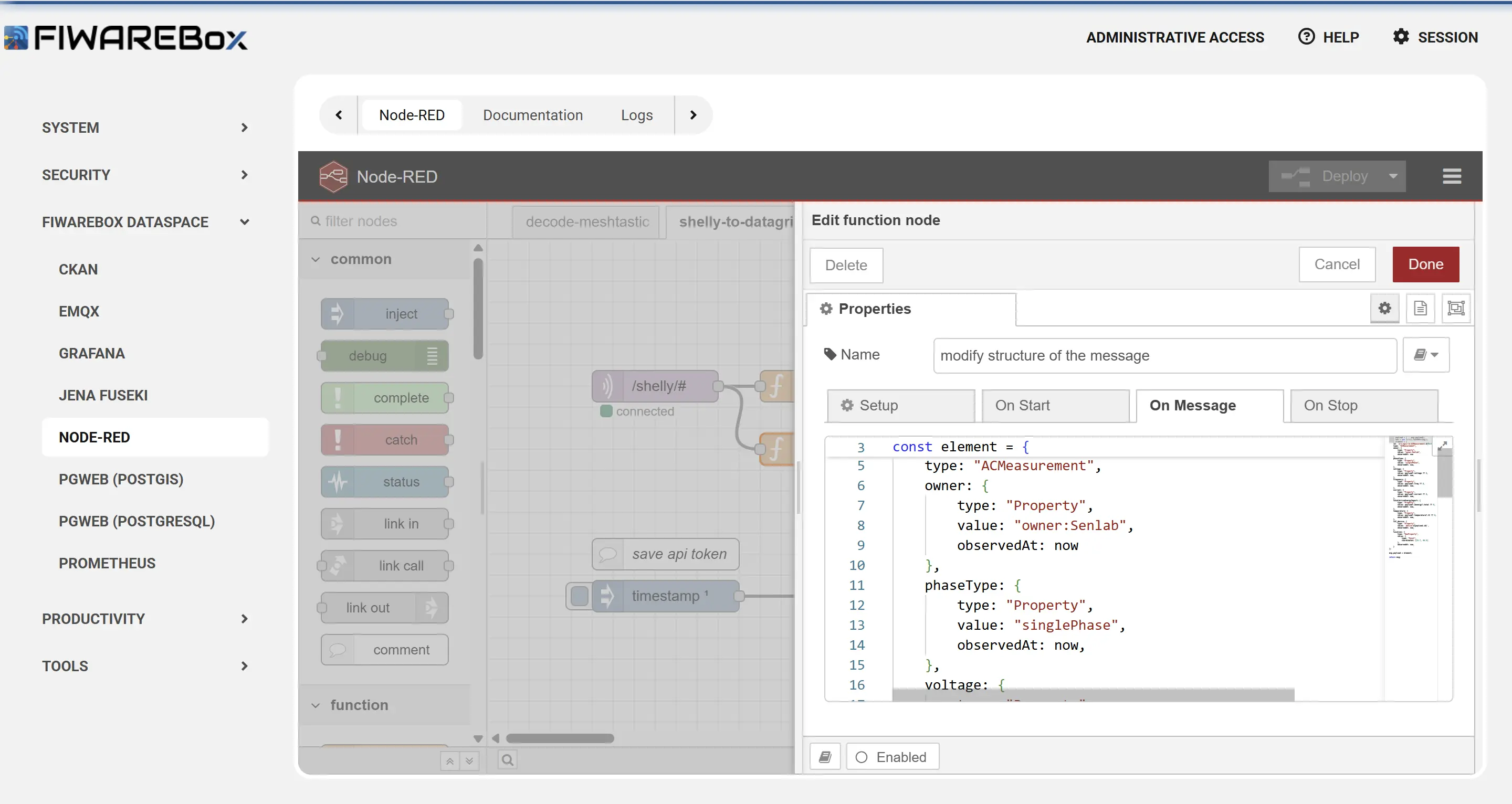 The flow subscribes to the MQTT Broker (part of the Vela Context Data Hub) where the Shelly Plug publishes its measurement data. Each message is received, parsed, and transformed into both data and metadata according to the Smart Data Models. The resulting JSON-LD entities are then sent to the Context Broker, where they become part of the live semantic data layer managed by DCaaS/DSaaS.